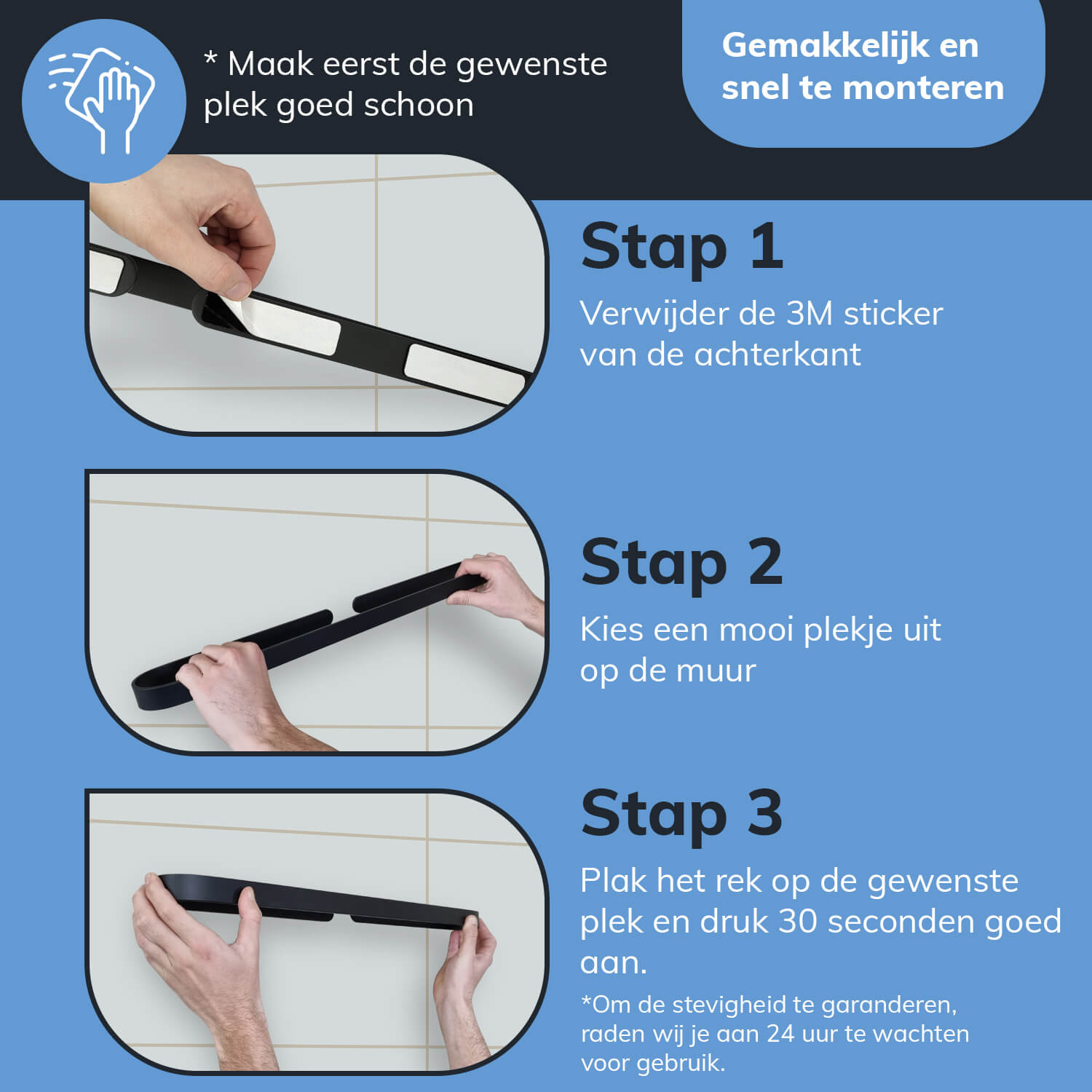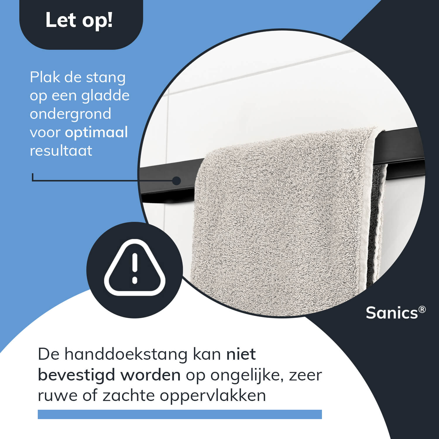 Let op: De handdoekstang kan niet bevestigd worden op ongelijke, zeer ruwe of zachte oppervlakken. Voor een optimaal resultaat plak je de handdoekstang op een gladde ondergrond. Het plakken op geverfde muren of behang raden wij ook af(bij het verwijderen komt de ondergrond wellicht los).