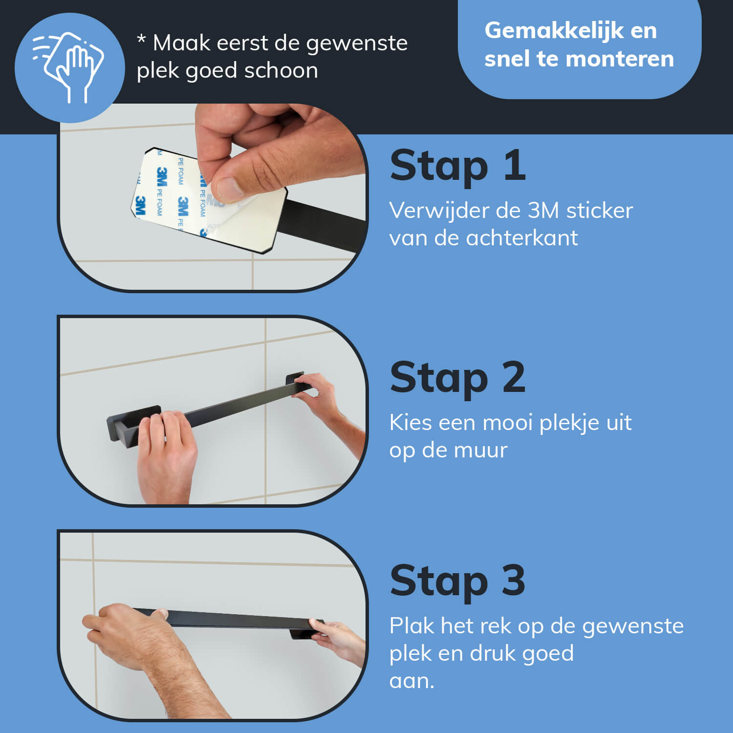 Let op: De handdoekstang kan niet bevestigd worden op ongelijke, zeer ruwe of zachte oppervlakken. Voor een optimaal resultaat plak je de handdoekstang op een gladde ondergrond. Het plakken op geverfde muren of behang raden wij ook af(bij het verwijderen komt de ondergrond wellicht los).