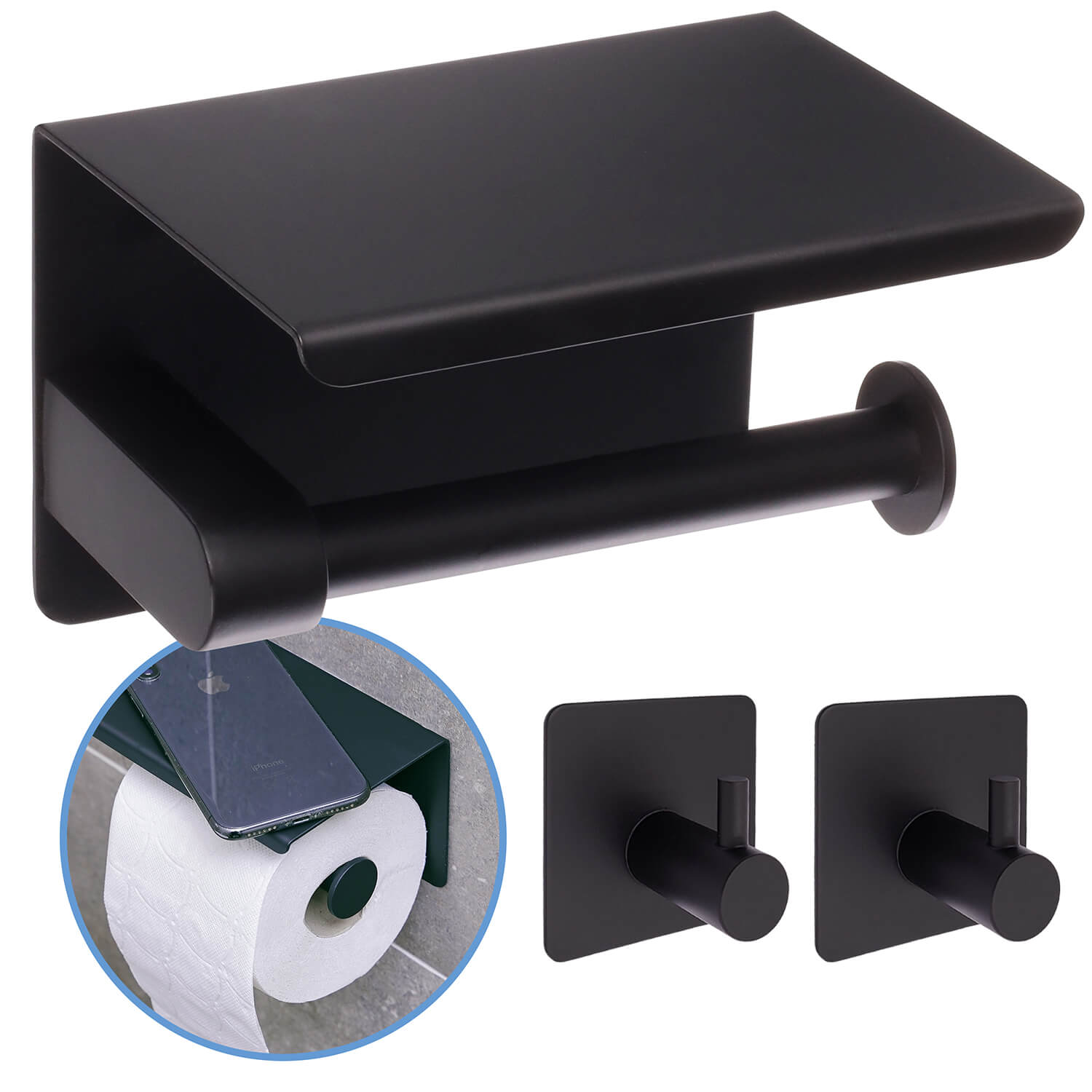 WC Rolhouder Zwart – Toiletrolhouder zonder Boren – WC Papier Houder Met Plankje – Zelfklevend – RVS – +2 Zelfklevende Handdoekhaakjes