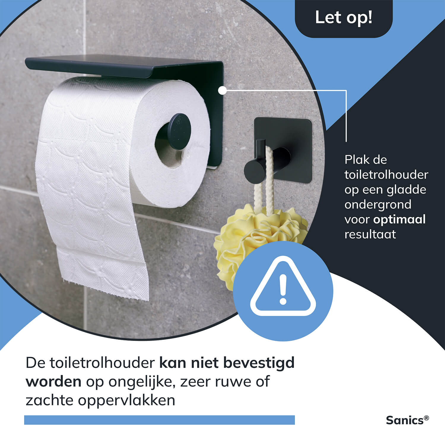 - Zorg dat je de toiletrolhouder op een gladde ondergrond plaatst.