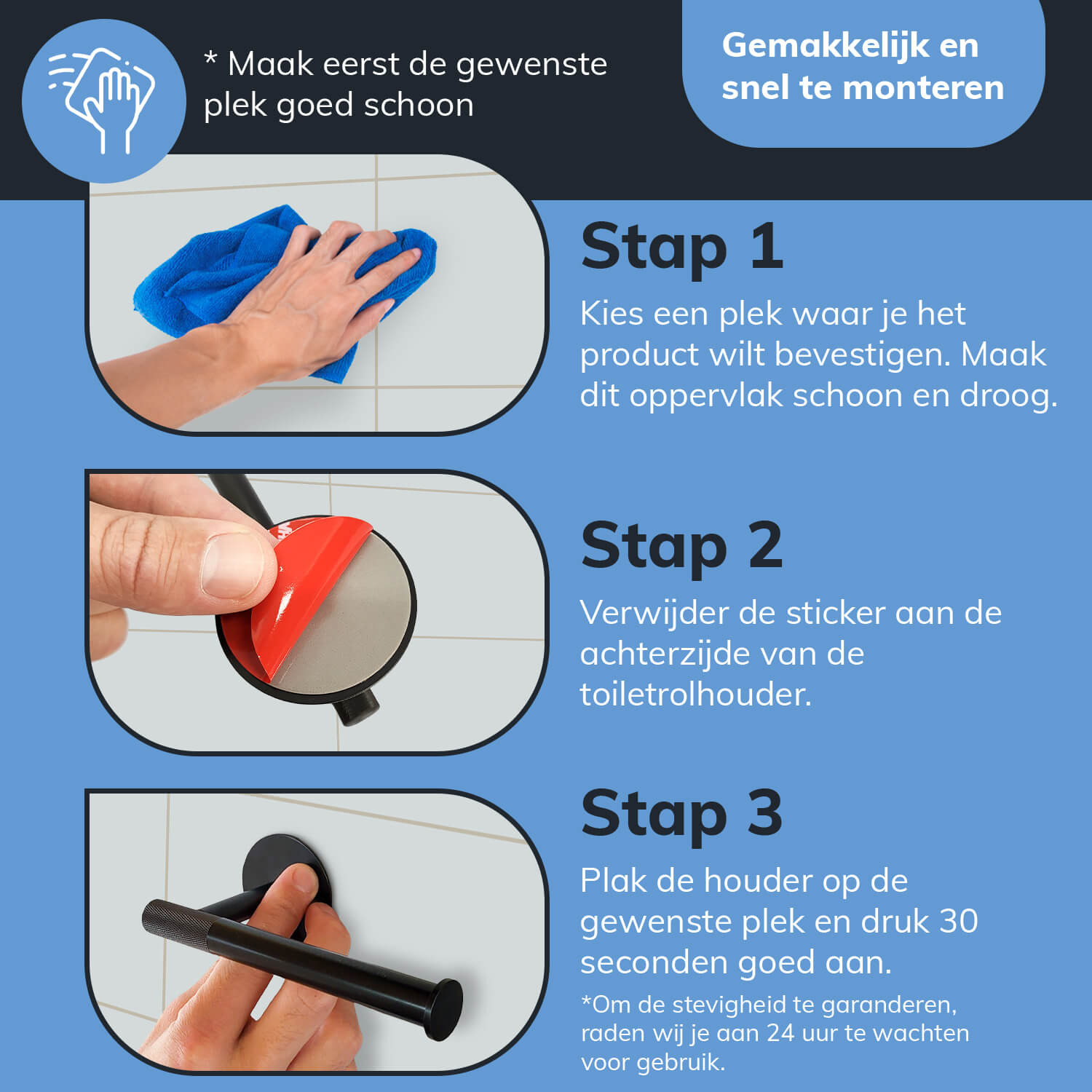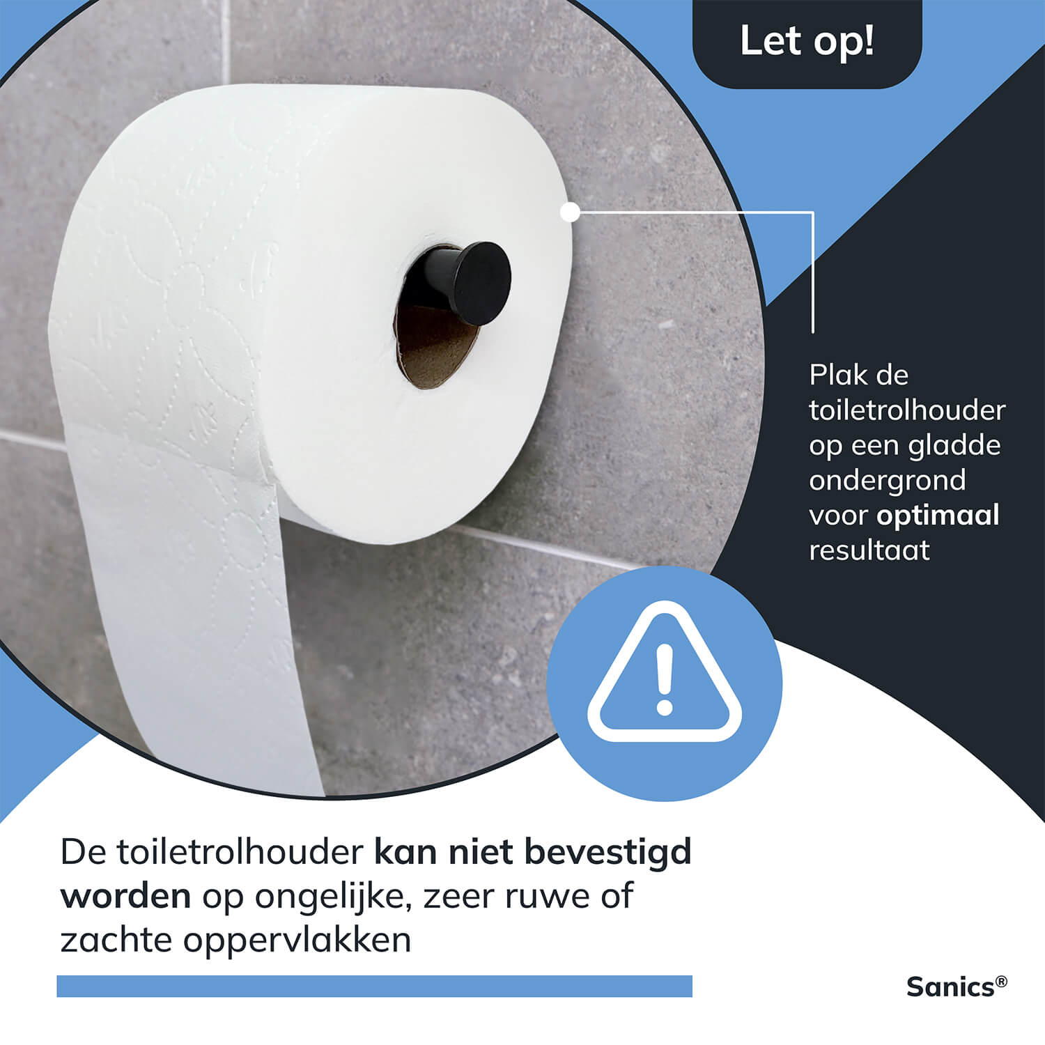Let op: De toiletrolhouder kan niet bevestigd worden op ongelijke, zeer ruwe of zachte oppervlakken. Voor een optimaal resultaat plak je de toiletrolhouder op een gladde ondergrond. Het plakken op geverfde muren of behang raden wij ook af(bij het verwijderen komt de ondergrond wellicht los).