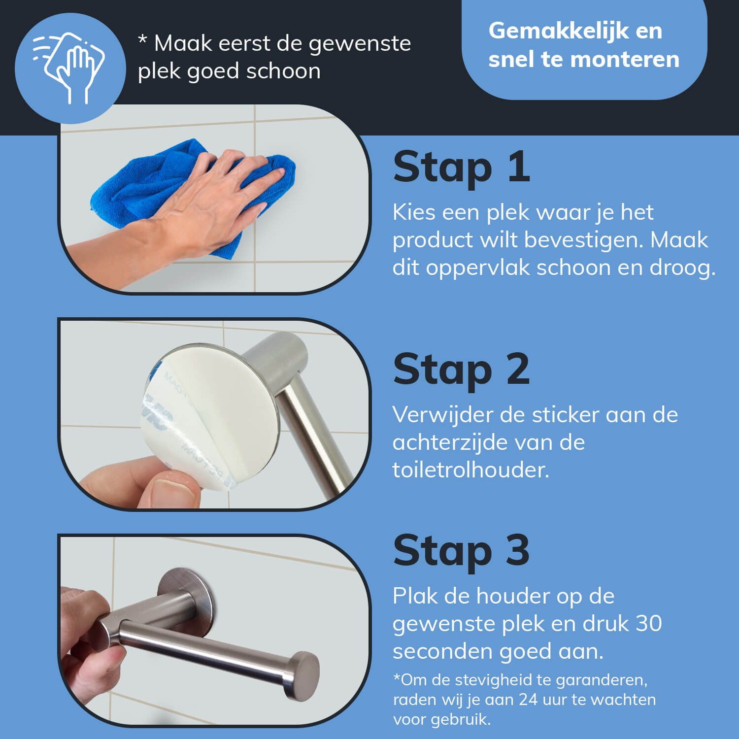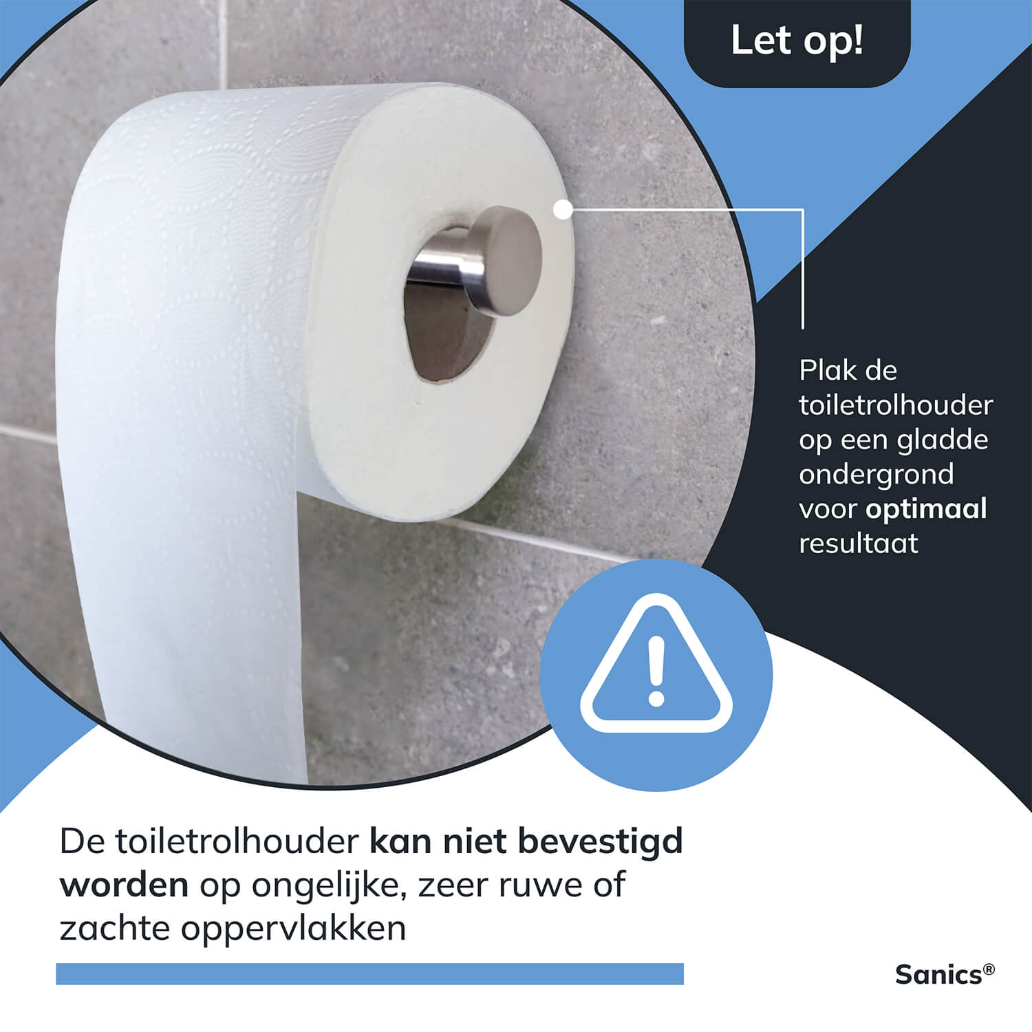 Let op: De toiletrolhouder kan niet bevestigd worden op ongelijke, zeer ruwe of zachte oppervlakken. Voor een optimaal resultaat plak je de toiletrolhouder op een gladde ondergrond. Het plakken op geverfde muren of behang raden wij ook af(bij het verwijderen komt de ondergrond wellicht los).