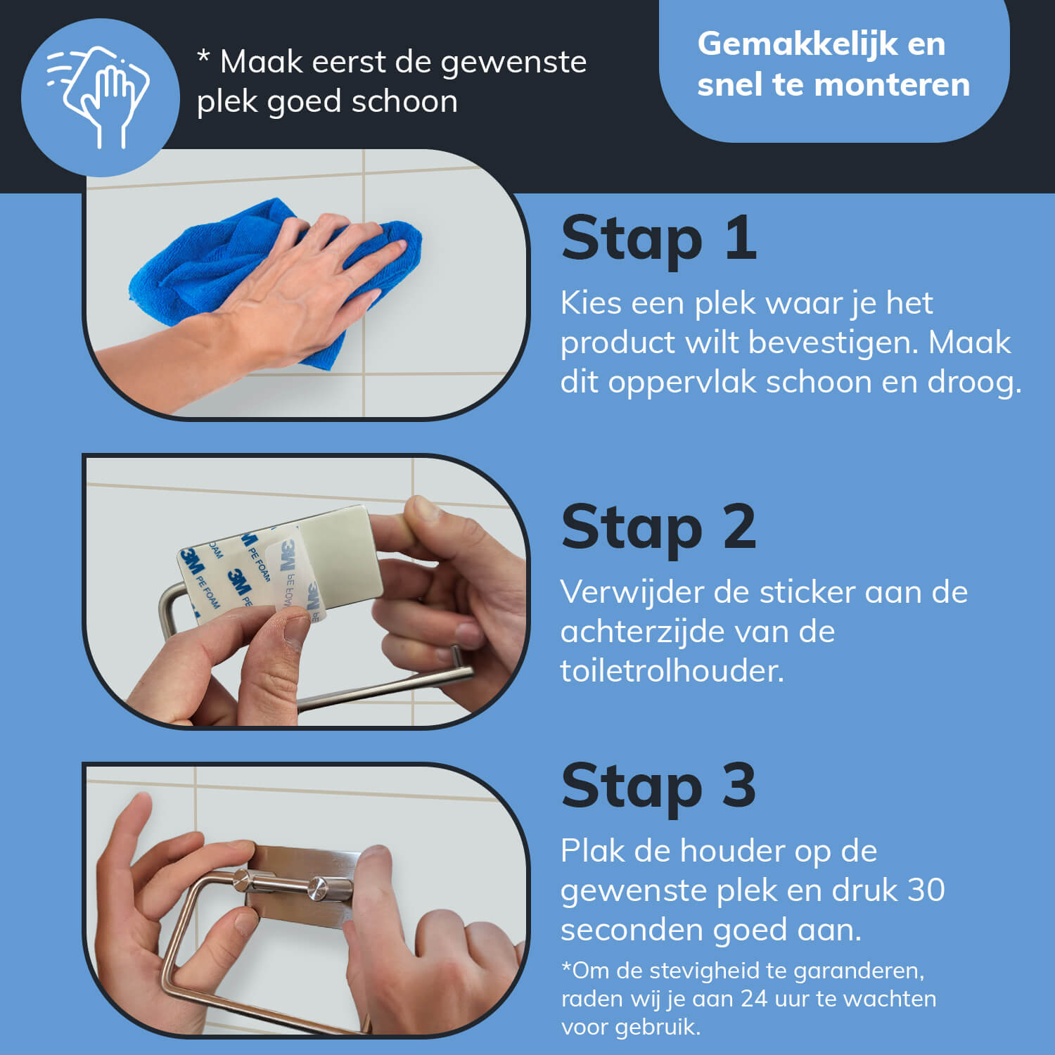De bevestiging van deze toiletrolhouder kan niet makkelijker. Aan de houder zit namelijk een 3M sticker verbonden, die je makkelijk aan je muur kan bevestigen in minder dan een minuut. De sticker zorgt voor een veilige en stevige bevestiging, zonder dat je daarbij in je muren of badkamertegels moet boren. Bovendien kan je met deze handige sticker de houder zowel verticaal als horizontaal bevestigen.